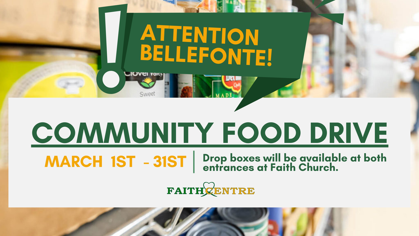 Help make a difference in our community this March by supporting the local food drive at the FaithCentre! Donations of items like rice, beans, canned goods, peanut butter, cereal, pasta, pet food, children’s snacks, and cleaning supplies will help stock the shelves for families in need. Donations can be dropped off at the FaithCentre or at either lobby entrance at Faith Church.